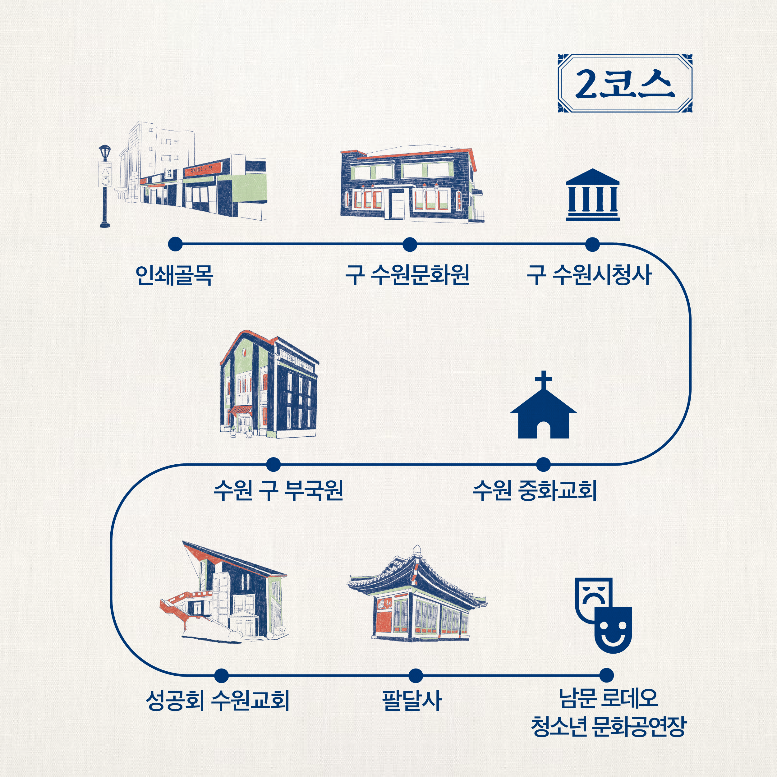 2코스 : 인쇄골목 > 구 수원문화원 > 구 수원시청사 > 수원 중화교회 > 수원 구 부국원 > 성공회 수원교회 > 팔달사 > 남문 로데오 청소년 문화공연장