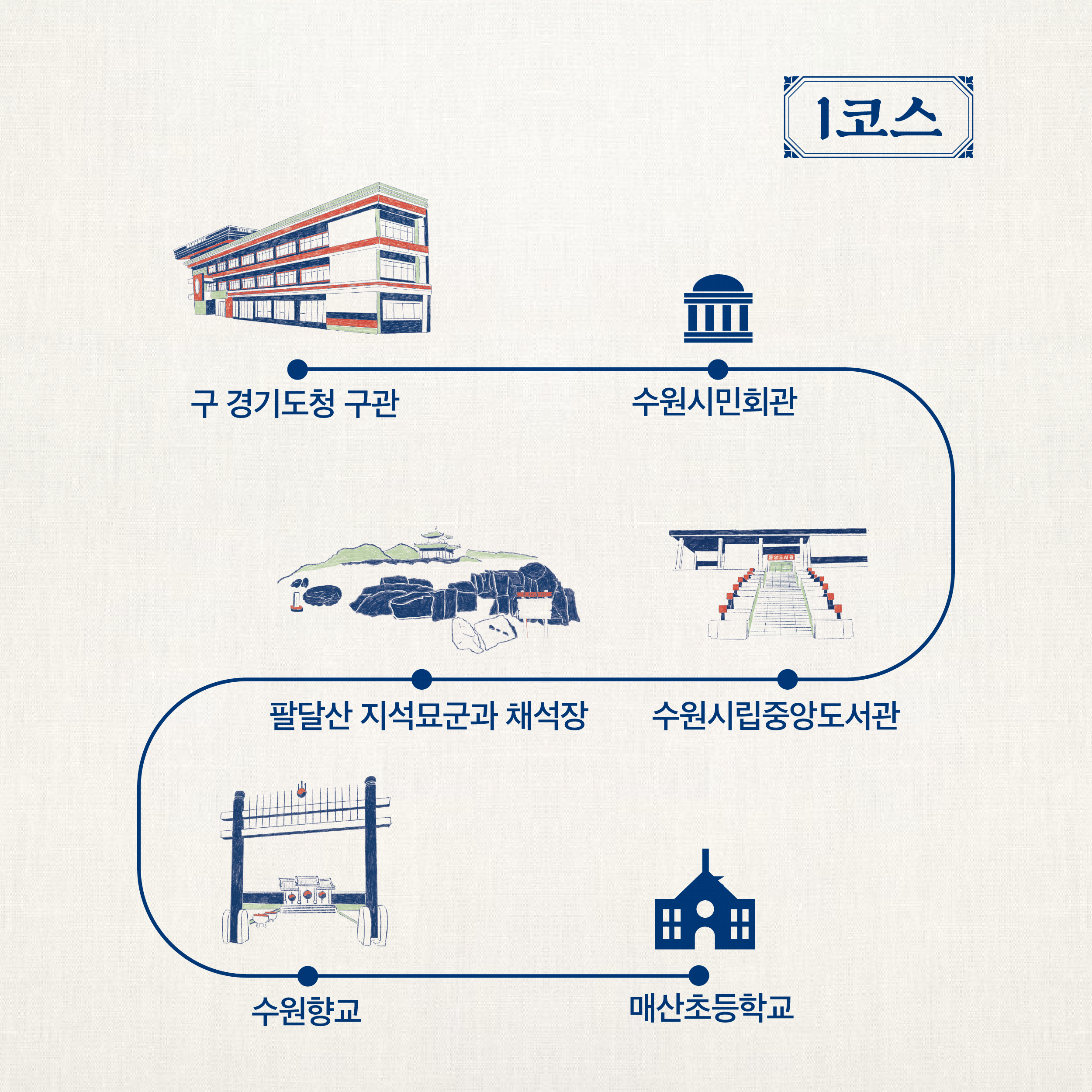 1코스 : 구 경기도청 구관 > 수원시민회관 > 수원시립중앙도서관 > 팔달산 지석묘군과 채석장 > 수원향교 > 매산초등학교